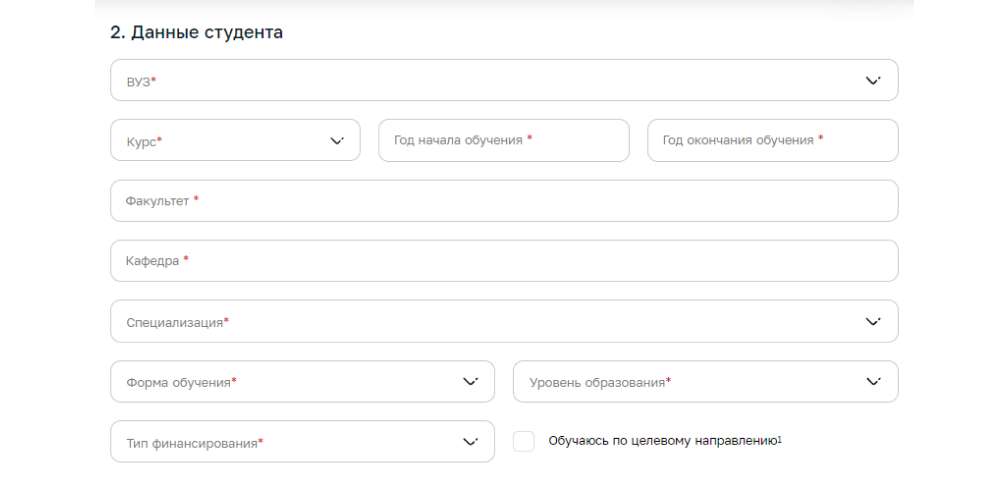 Важно! Выбираем значения только из выпадающего списка в полях. Кроме 4-х полей: “Год начала обучения”, “Год окончания обучения”, “Факультет” и “Кафедра”.