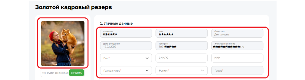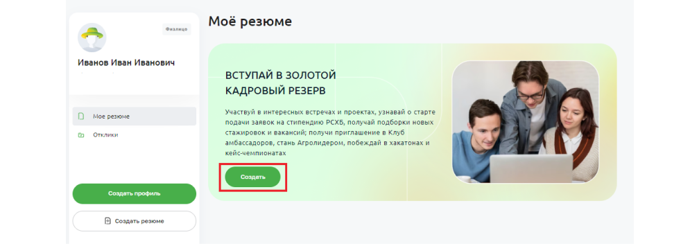 В своем личном кабинете нажимаем на кнопку «Создать» — так вы вступаете в «Золотой кадровый резерв».