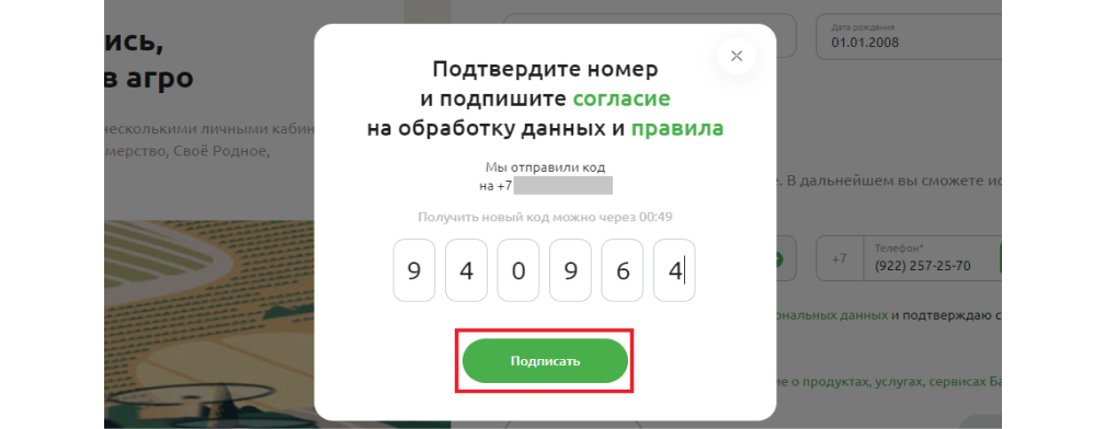 Вам придет код на указанный номер телефона или почту в зависимости от того, что вы подтверждаете. Введите код в форму и подпишите «Согласие на обработку данных и правила», нажав кнопку «Подписать».