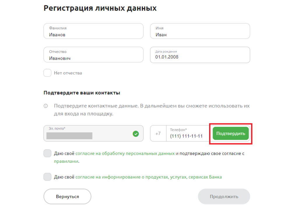 После ввода данных потребуется подтвердить номер телефона или почту, нажав на кнопку «Подтвердить».