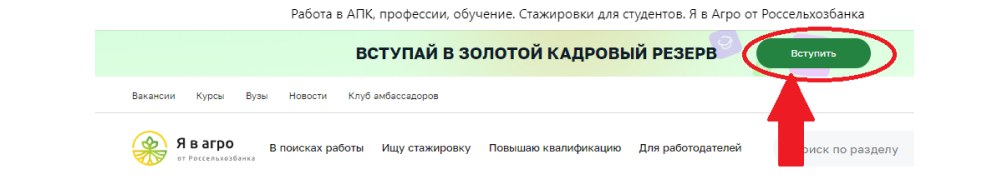 Нажимаем в самом верхнем баннере «Вступить» в золотой кадровый резерв.