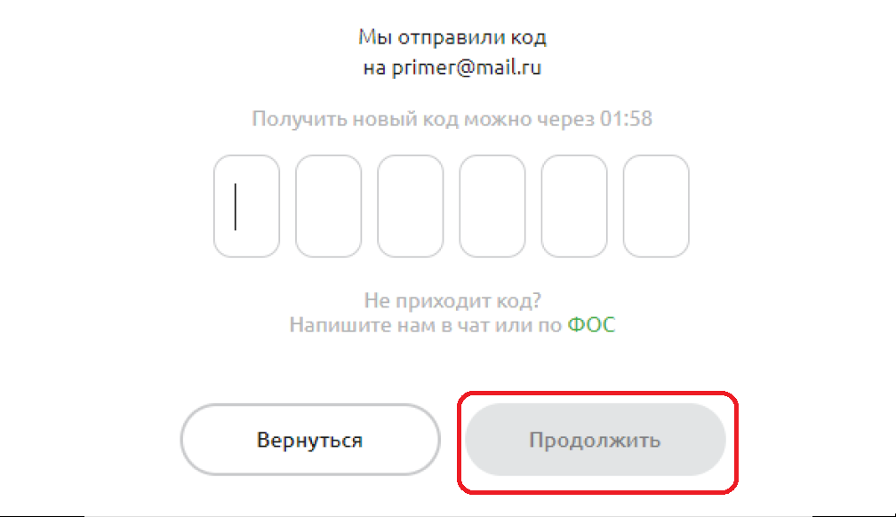 Вам на указанную электронную почту или номер телефона придет код, который требуется ввести в форму регистрации и нажать «Продолжить».