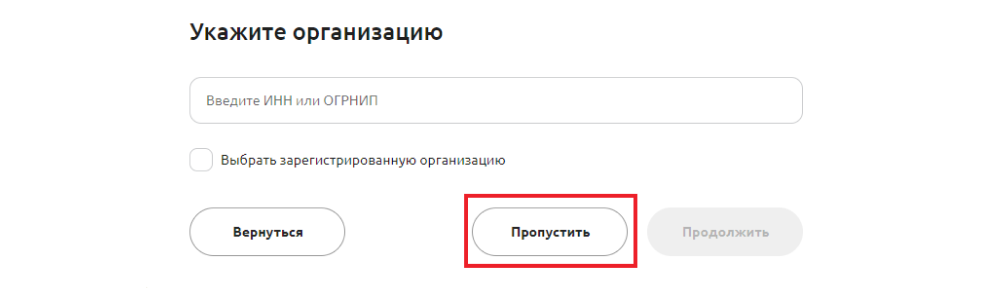 На шаге «Укажите организацию» нажимаете кнопку «Пропустить».