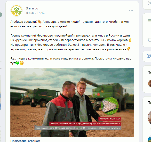 Стоит публиковать и репутационный контент: описание интересных кейсов, результатов работы, практики, стажировки. Например, ребята рассказали о профессиях в компании «Черкизово», выложив ролик.