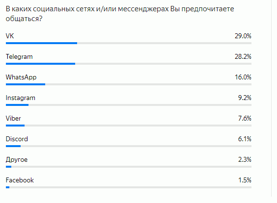 Самыми популярными социальными сетями, по результатам опроса, оказались VK, Telegram и WhatsApp.