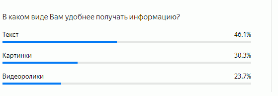 Однако из результатов опроса можно сделать вывод, что самый удачный способ подачи информации совмещает в себе текст, иллюстрации и видеозаписи, так как показатели всех трёх вариантов ответа численно близки.