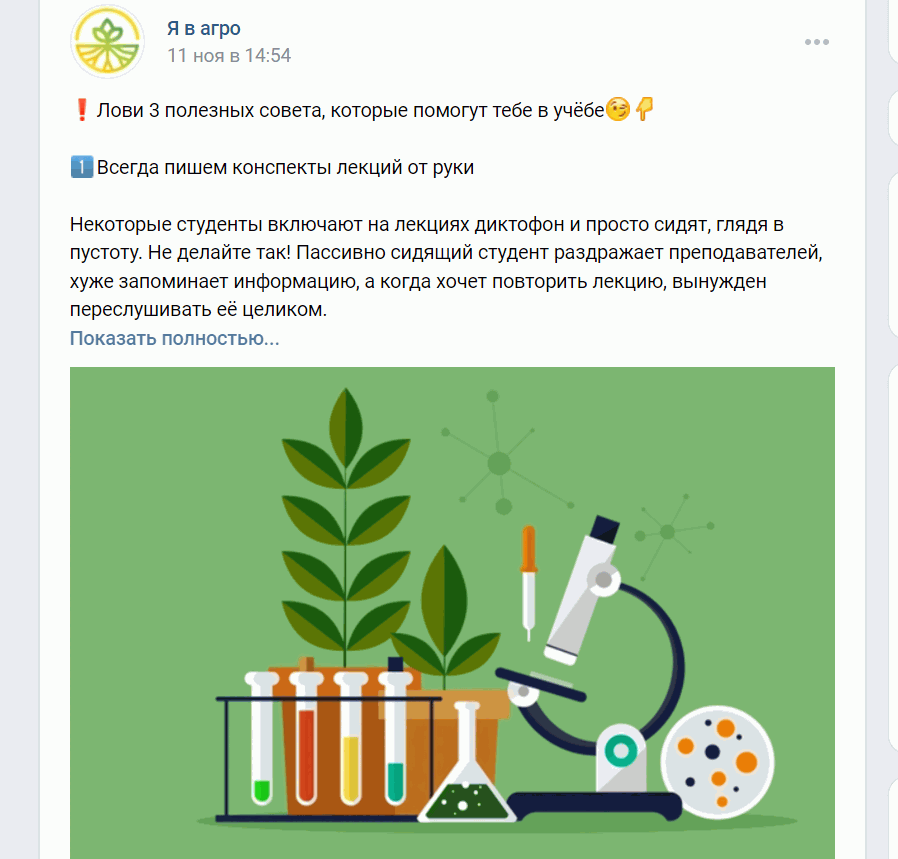 Другой тип контента – образовательный, или полезный. Его задача – обучить чему-то аудиторию, дать совет, рекомендацию, поделиться лайфхаком. Это могут быть и новости компаний, университета, города. В группе ВК ребята выкладывают, например, такие советы: