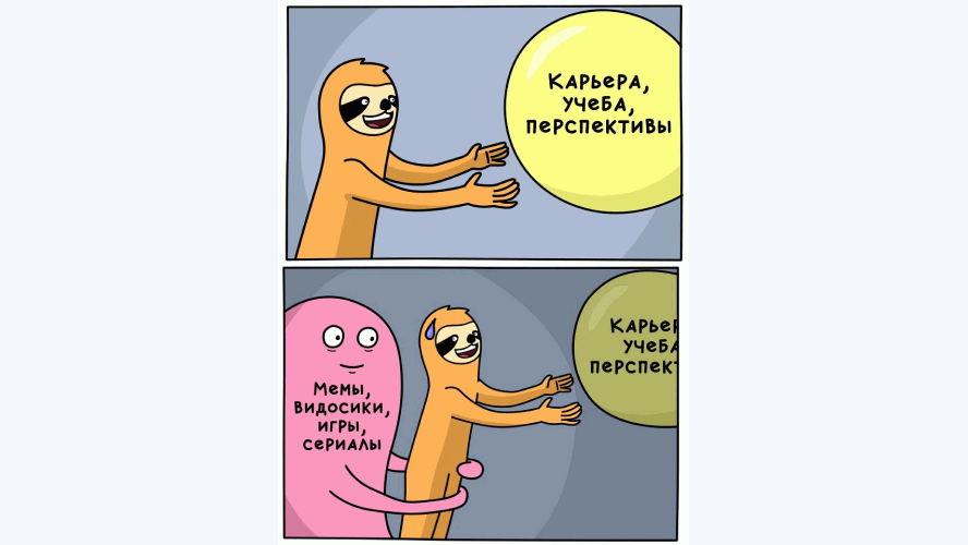 Огромную часть управления занимает именно обезьянка сиюминутного удовольствия. Обычно она стоит у руля и думает, как бы нам получить побольше удовольствия. Именно она смотрит котиков в соцсетях и развлекает себя как может. А рациональный тип ей постоянно говорит: «Ну давай, возьми себя в руки, давай что-нибудь сделаем».