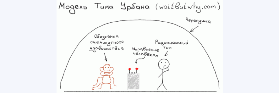 Чтобы понять, как все это работает, хочу обратить внимание на модель Тима Урбана, который в своем блоге несколько лет назад написал серию статей про устройство мозга прокрастинатора. Согласно его теории, в нашем мозге есть панель управления, и за панелью управления находятся два существа — это обезьянка сиюминутного удовольствия и рациональный тип. Если кто-то интересовался вопросами прокрастинации, наверно, вы видели эту картинку.